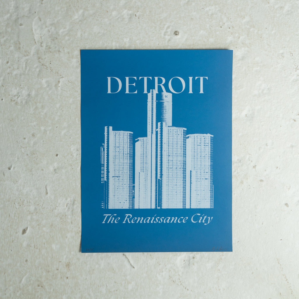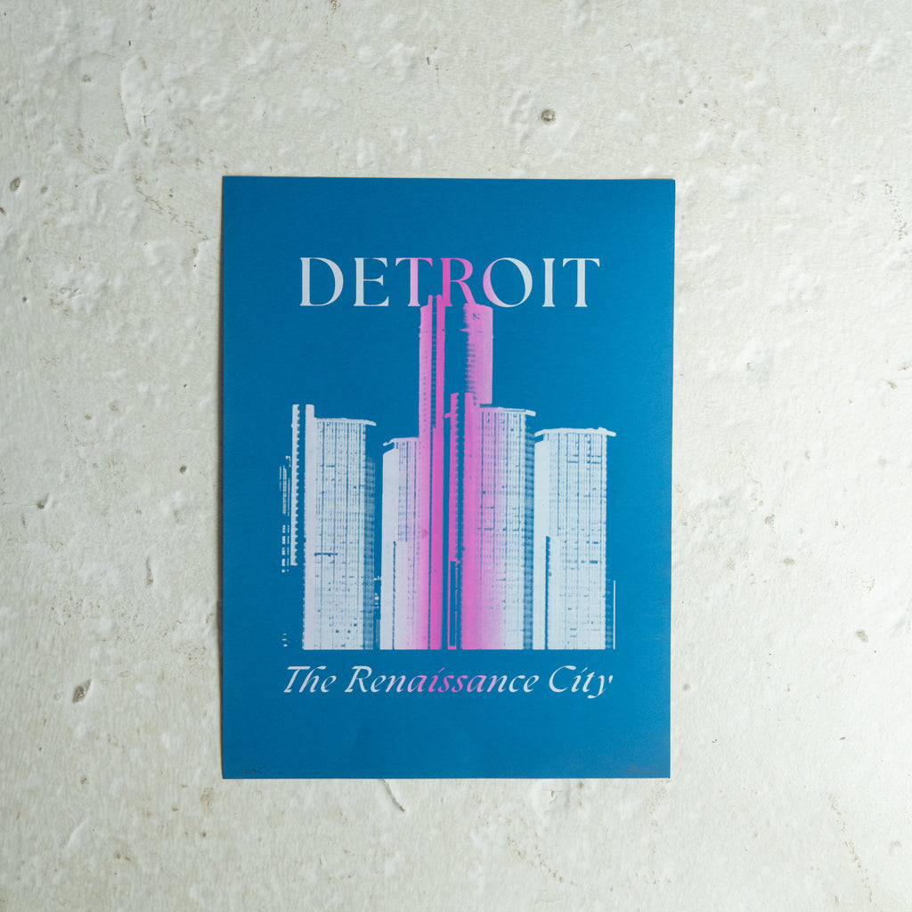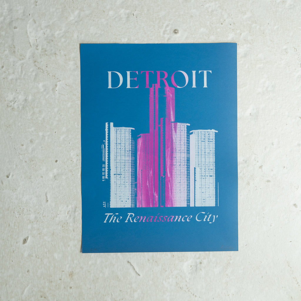 We created this print depicting a landmark building in our city, the Renaissance Center. With talk of demolishing this iconic Brutalist structure, which has dominated our skyline since 1977, we wanted to honor it. It might have never lived up to its hype, but now more than ever, the feeling of Renaissance is strong in Detroit.