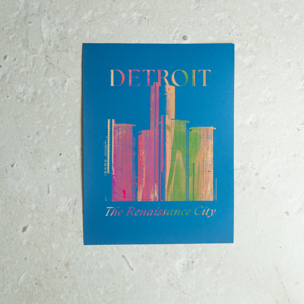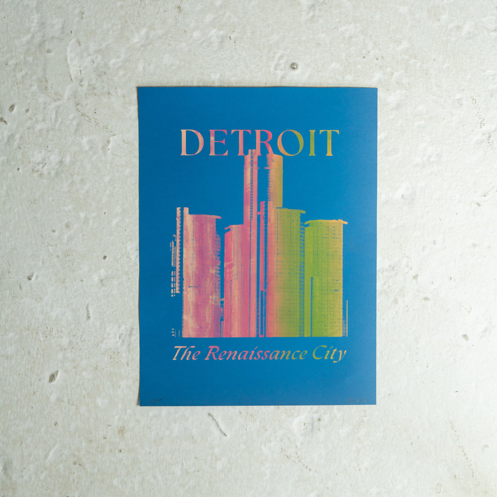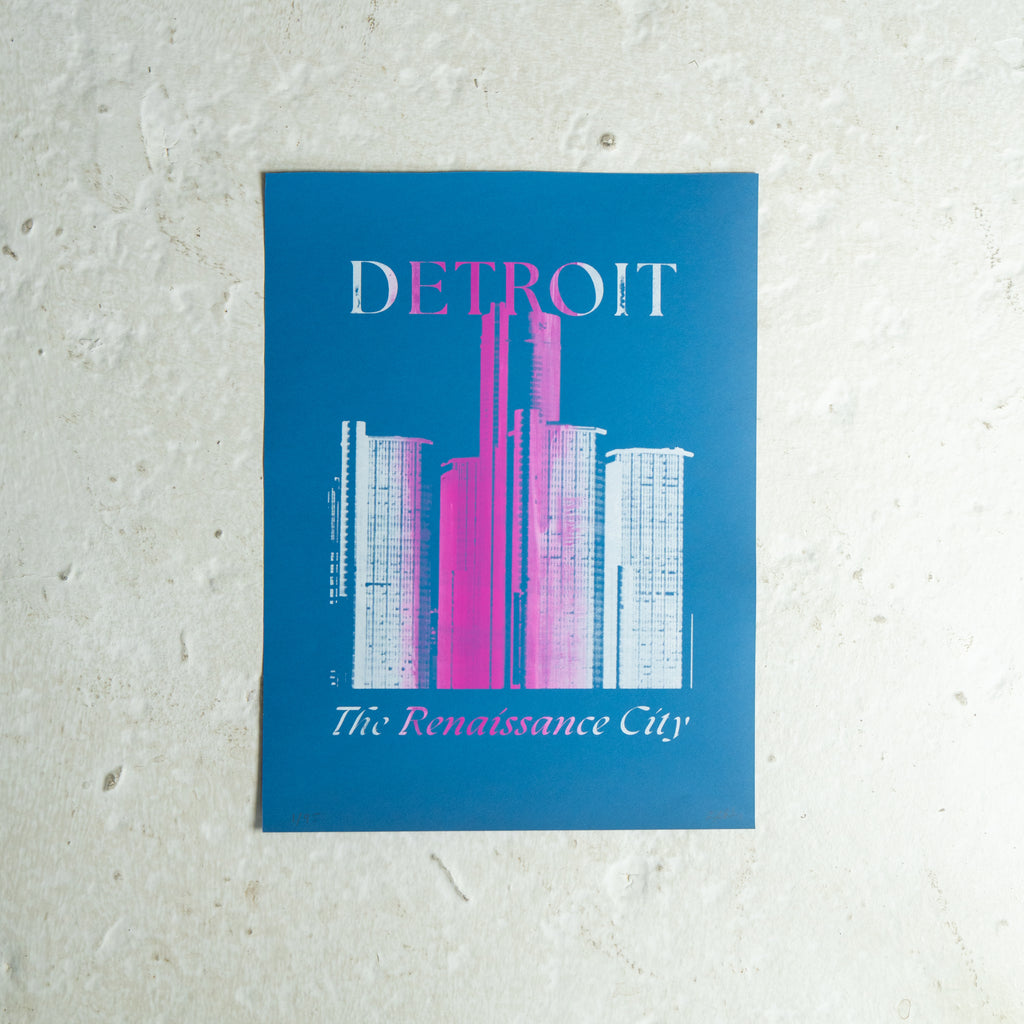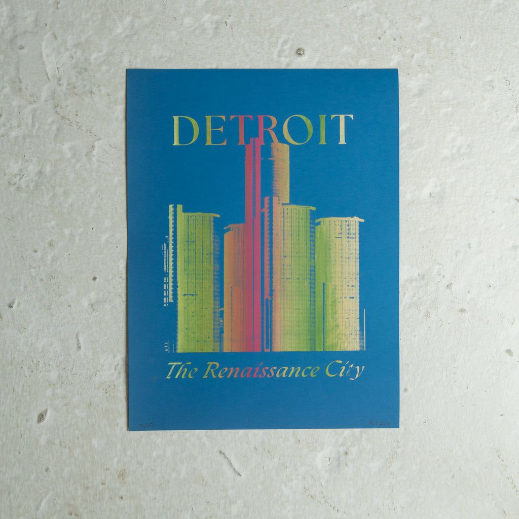 We created this print depicting a landmark building in our city, the Renaissance Center. With talk of demolishing this iconic Brutalist structure, which has dominated our skyline since 1977, we wanted to honor it. It might have never lived up to its hype, but now more than ever, the feeling of Renaissance is strong in Detroit.