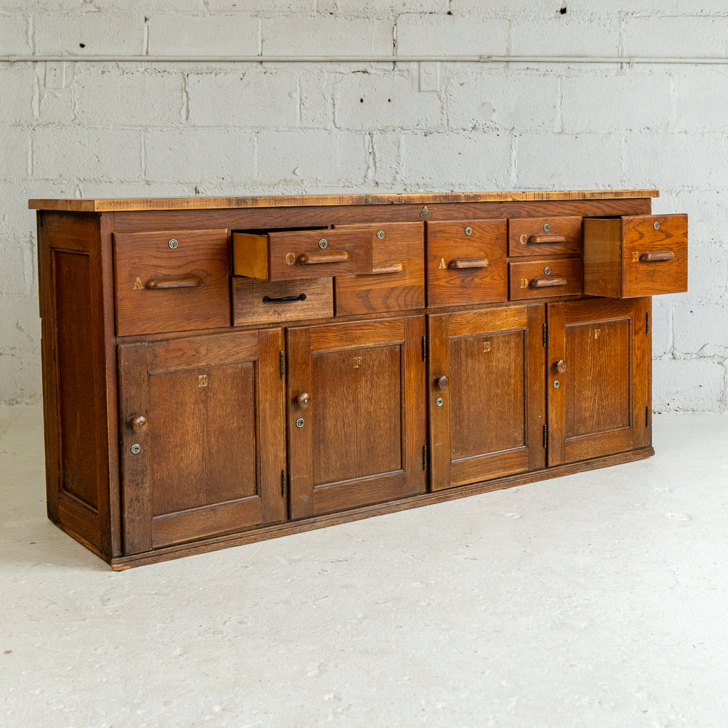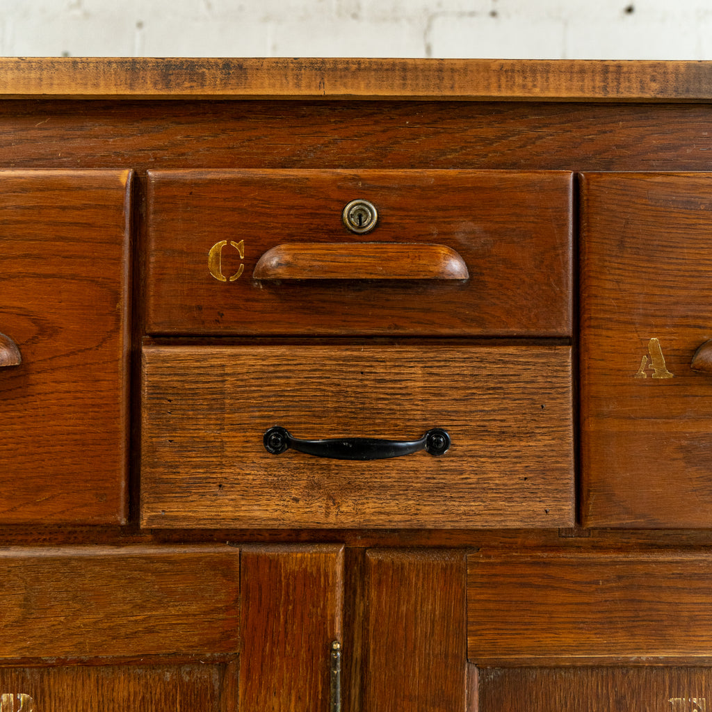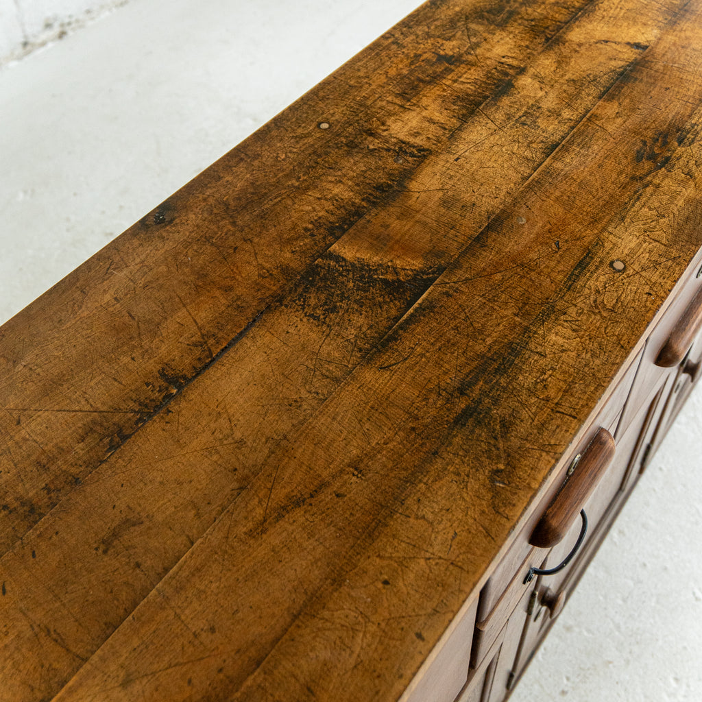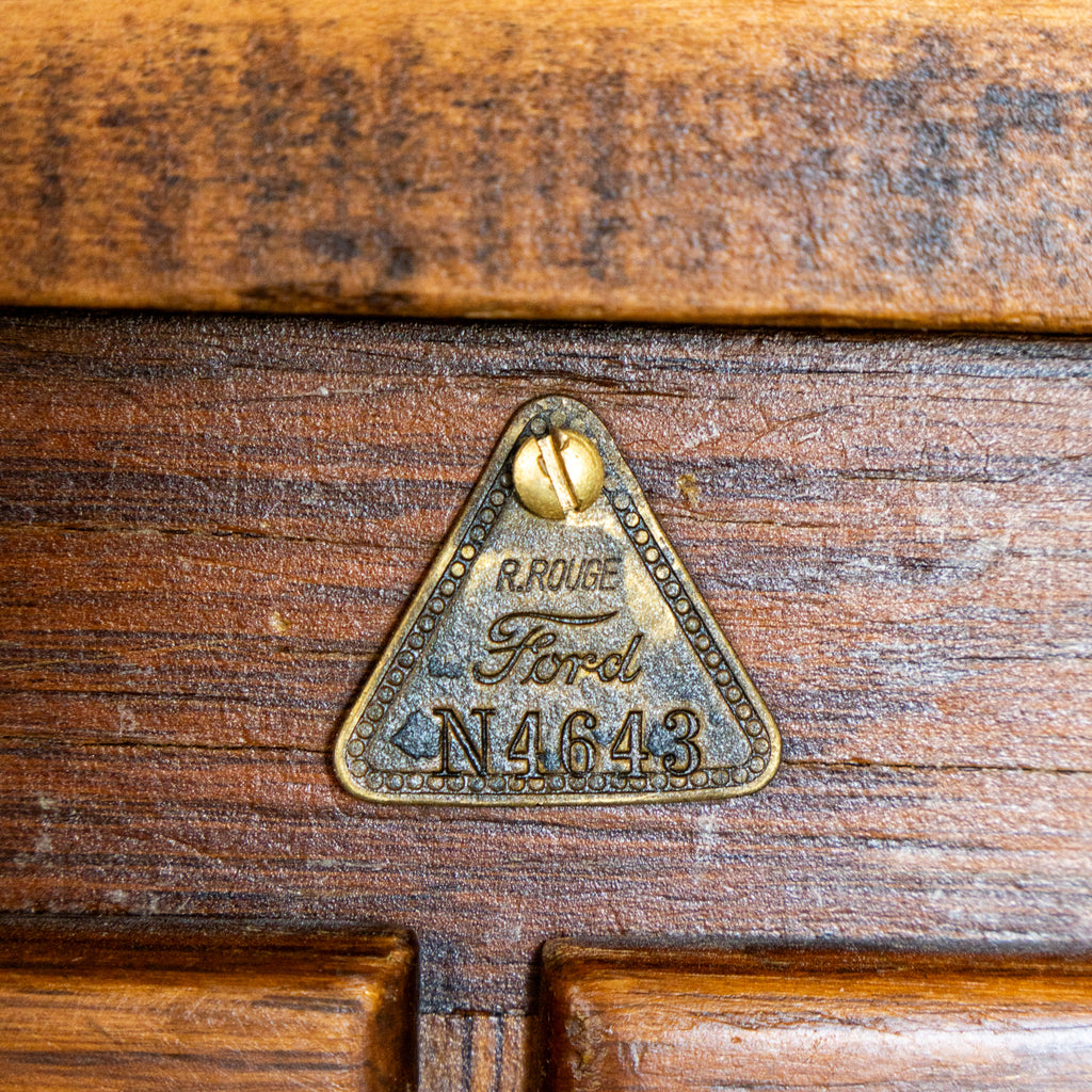 The Ford Factory Multi-Drawer Cabinet features eight wooden drawers with a mix of wood and metal handles, paired with five cabinet doors for ample storage. Topped with a butcher block slab salvaged from the Ford River Rouge Plant, it still retains its original brass Ford River Rouge tag, No. 4693.