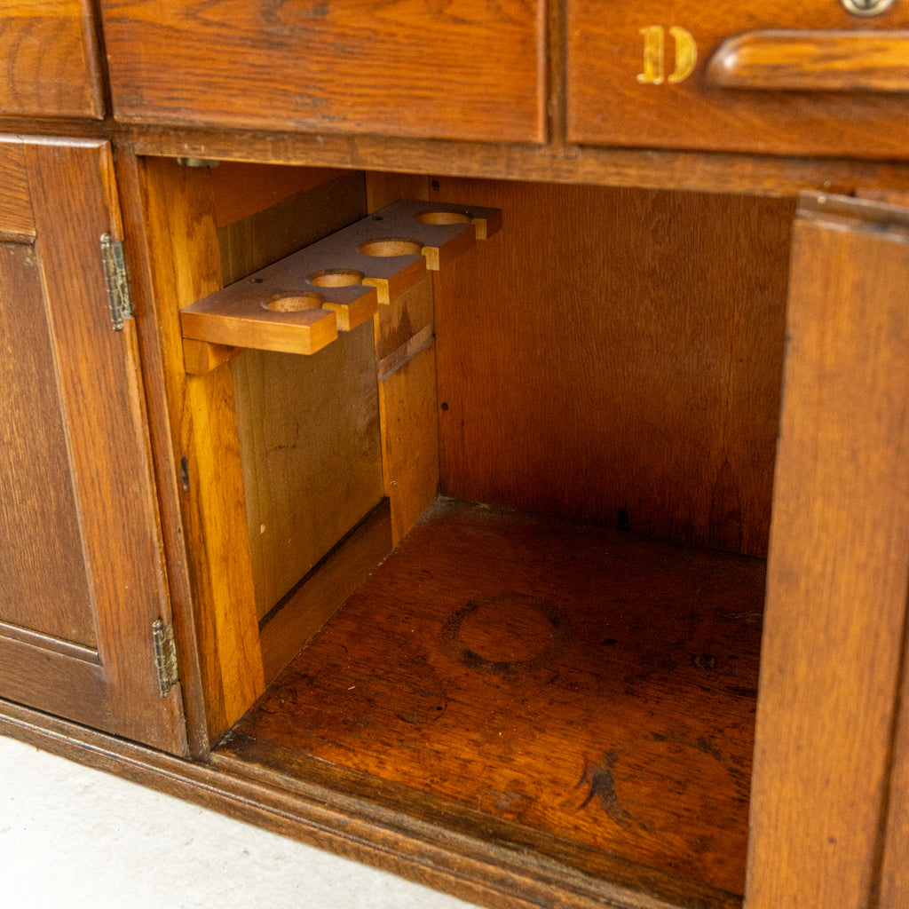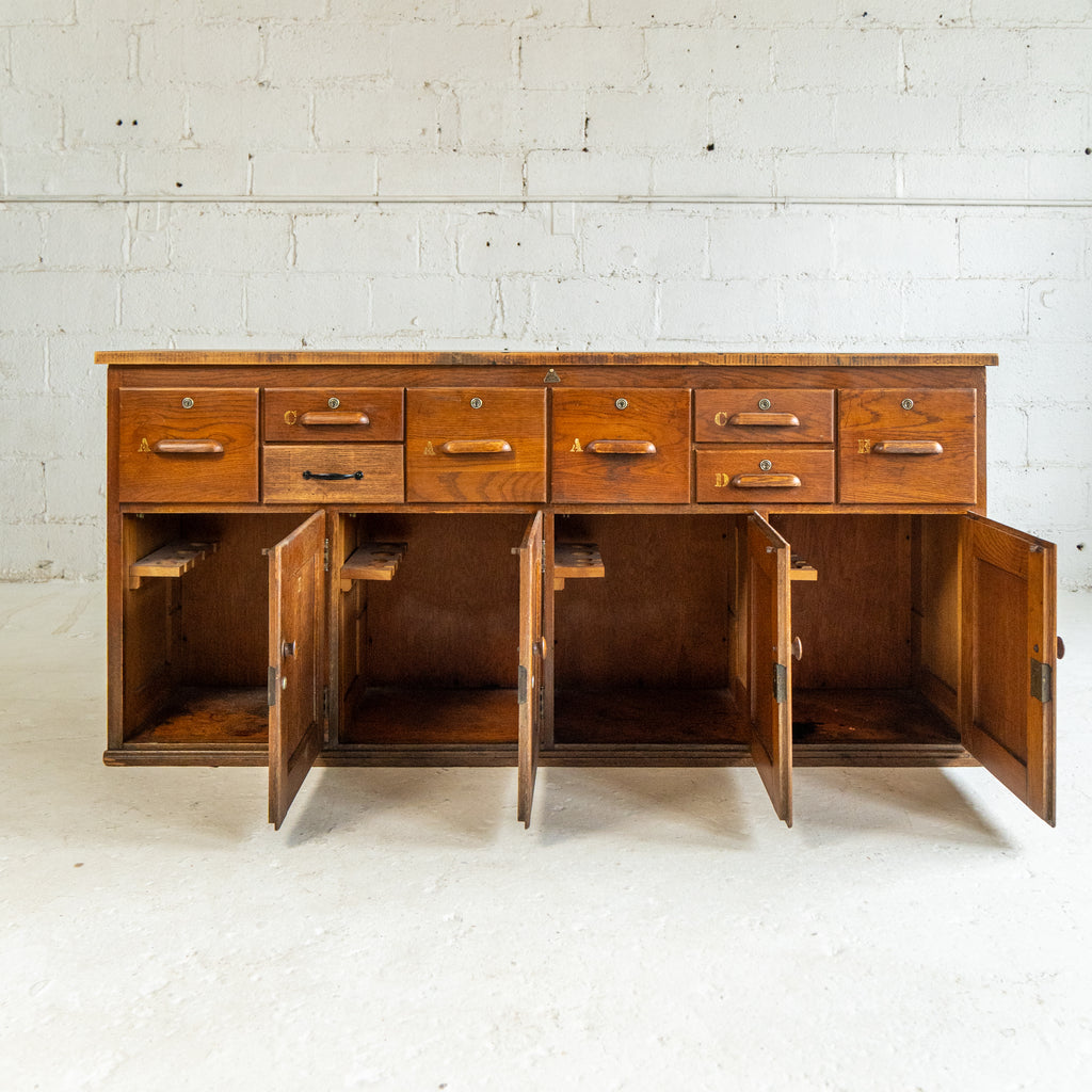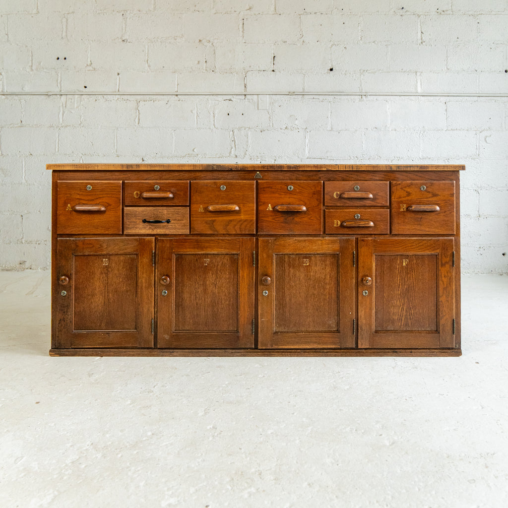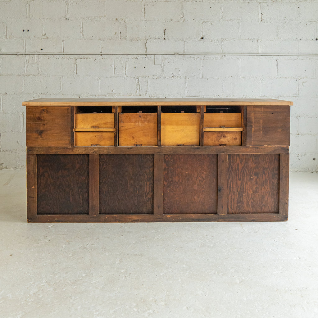 The Ford Factory Multi-Drawer Cabinet features eight wooden drawers with a mix of wood and metal handles, paired with five cabinet doors for ample storage. Topped with a butcher block slab salvaged from the Ford River Rouge Plant, it still retains its original brass Ford River Rouge tag, No. 4693.