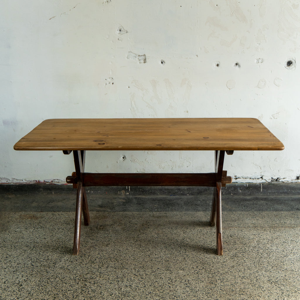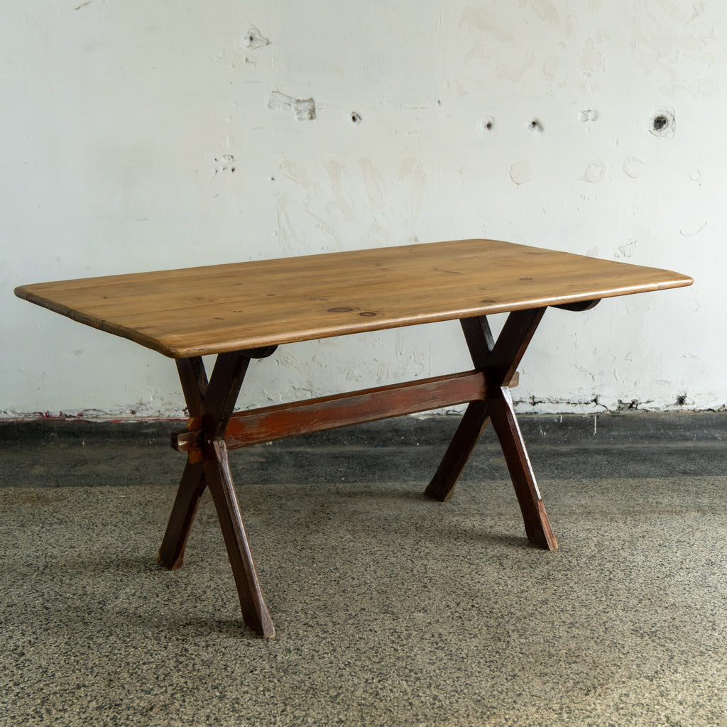 This primitive crossed-legged dining table is made of pine and in great antique condition. Perfect for a cabin or small apartment. Pair it in a rustic environment or mix it will some contemporary decor.