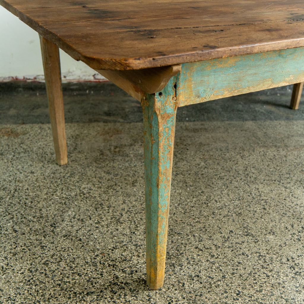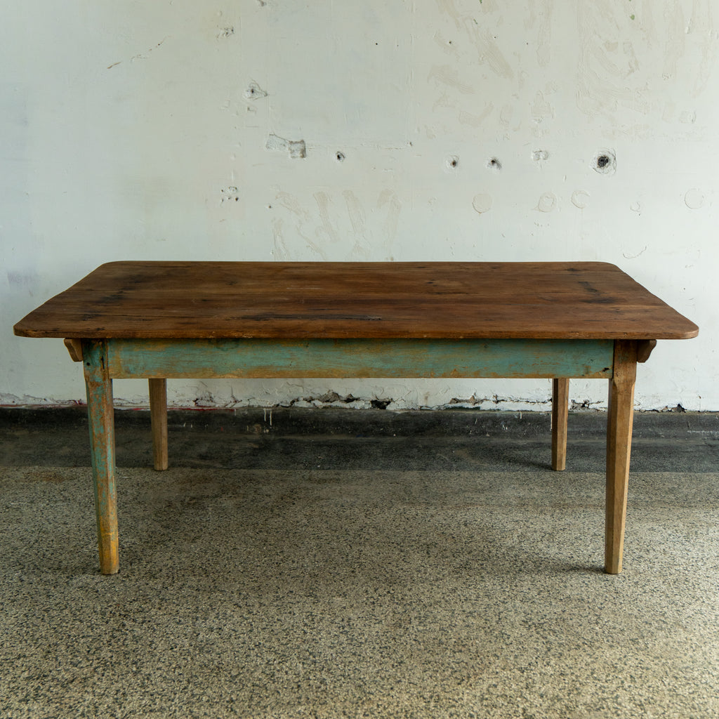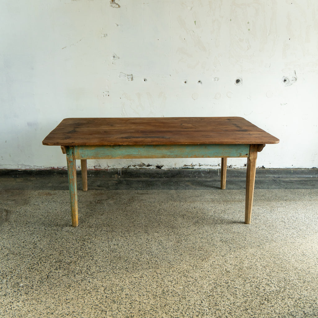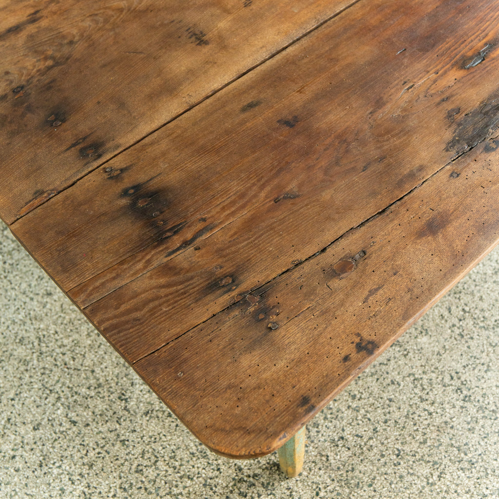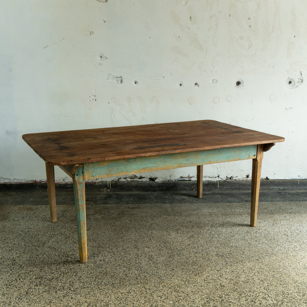 A handmade antique scrubbed farmhouse table with tapered legs. The top consists of two wide planks of oak boards. Paired with a painted oak base. Antique nail heads are clearly visible throughout. The table is charming and durable, looking forward to many years to come.