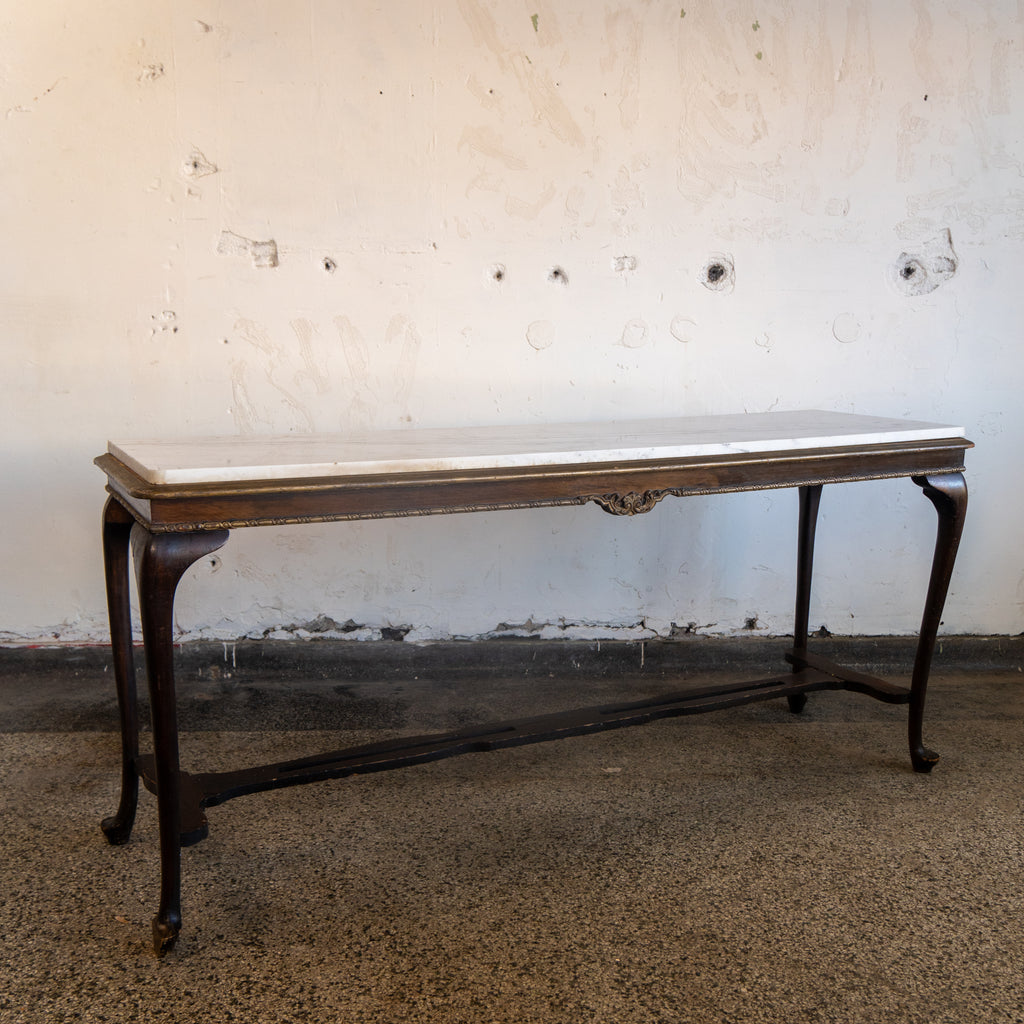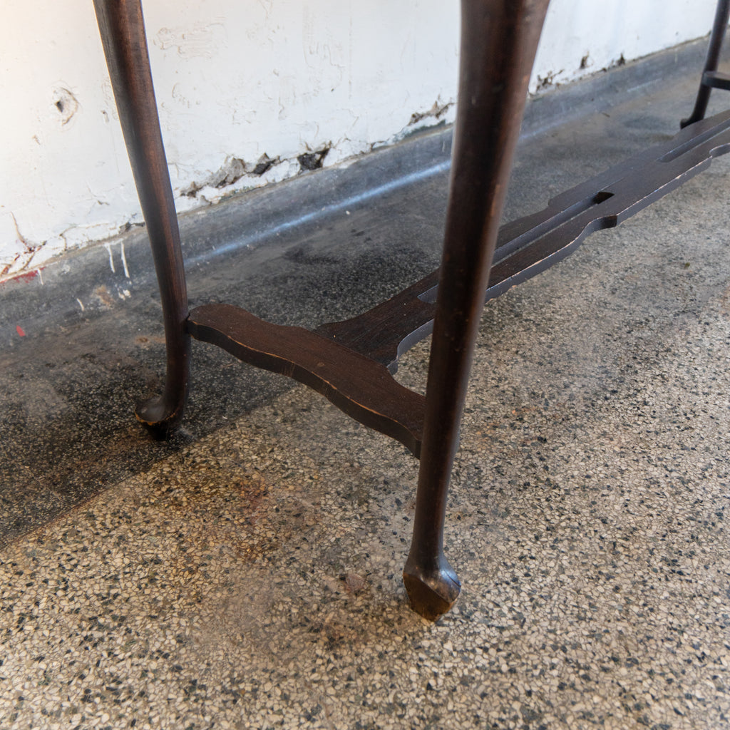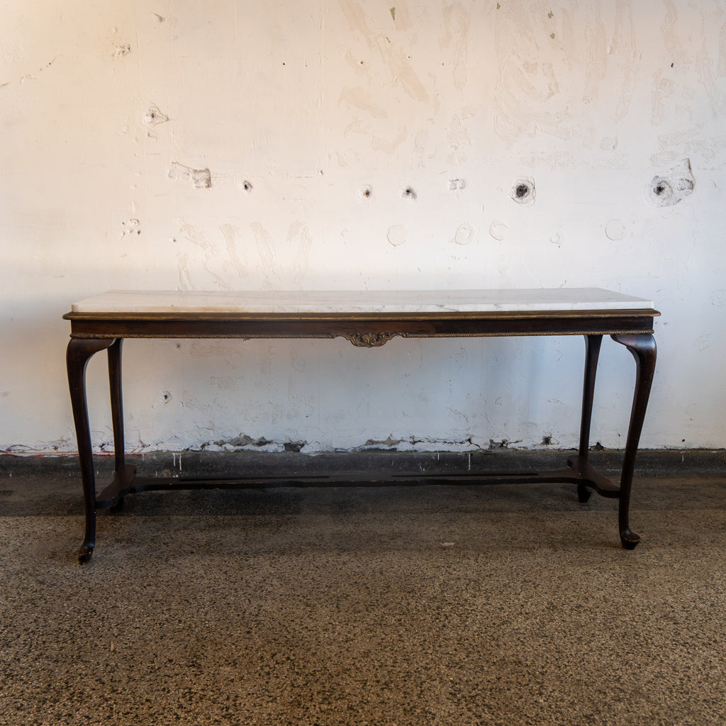 This Antique Marble Entry table features cast iron legs, a wooden table base & trim with a marble top. Ideal for creating a memorable first impression in entryways or serving as a sophisticated table for any space.