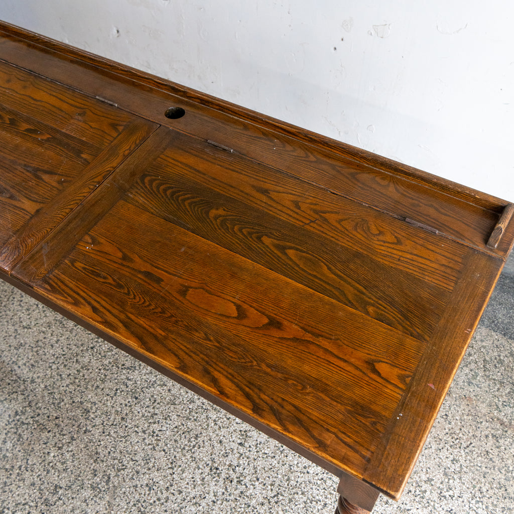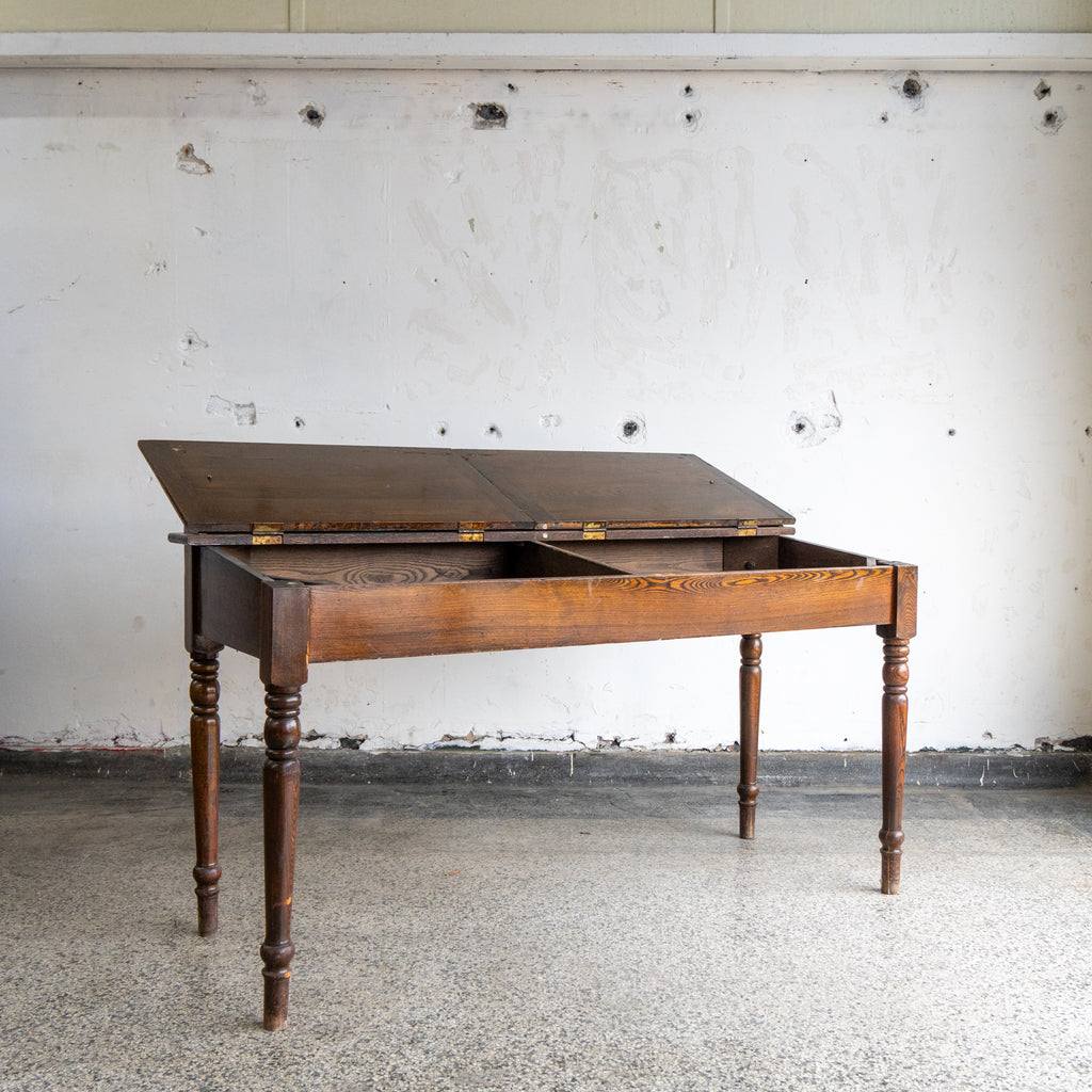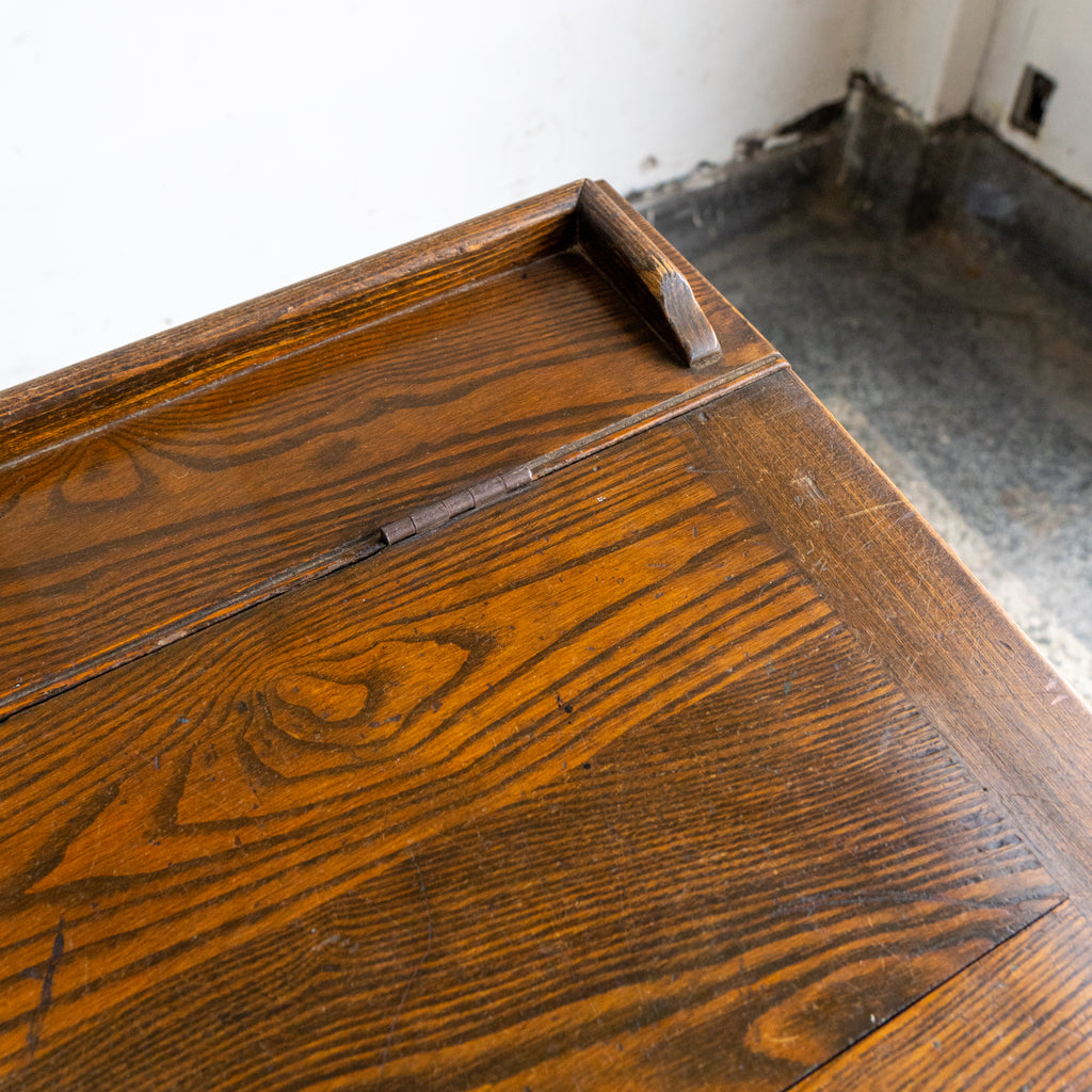 Lovely antique writing desk. We believe it to be made of Ash wood. Came from a building by our warehouse in Hamtramck. Has two lift tops with storage underneath it.