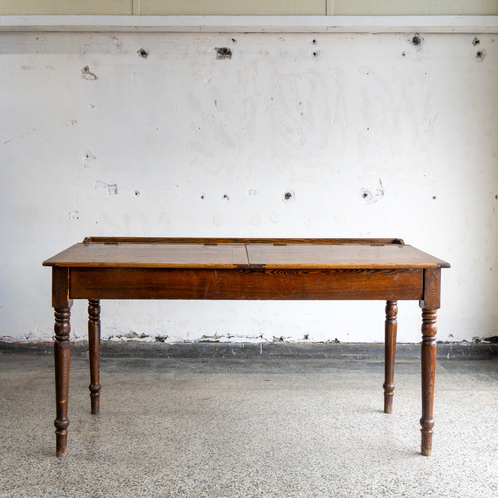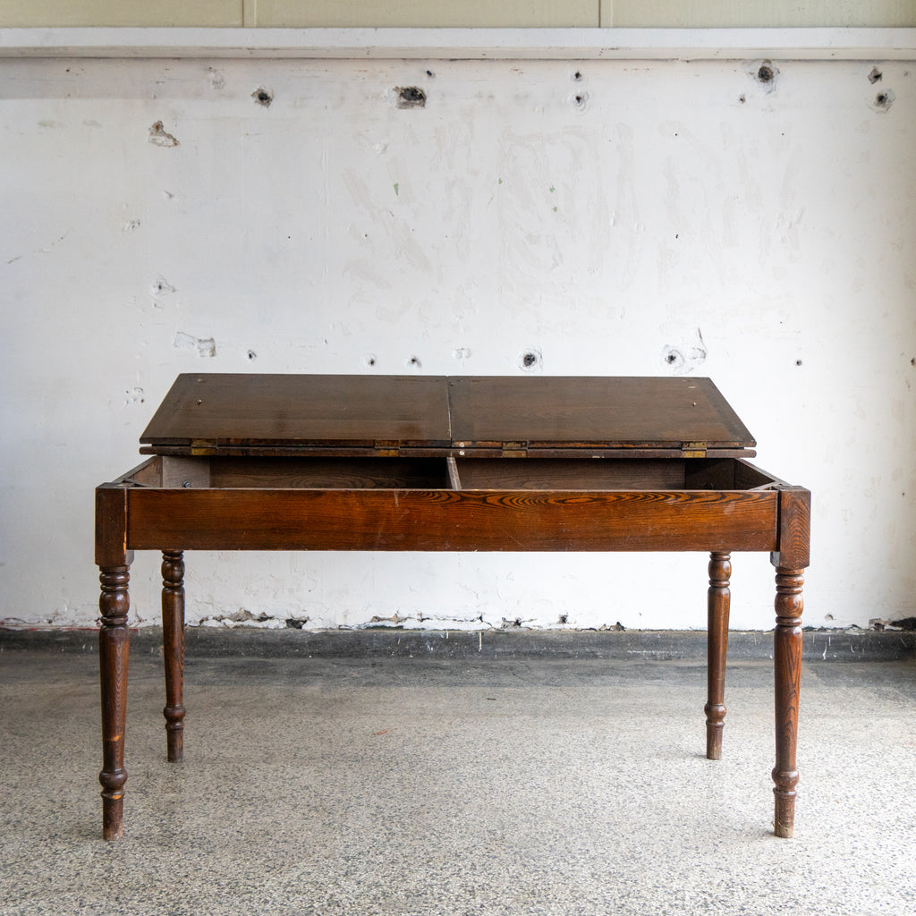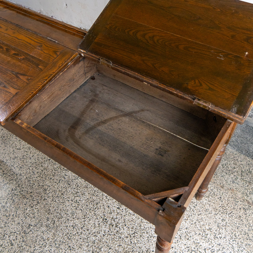 Lovely antique writing desk. We believe it to be made of Ash wood. Came from a building by our warehouse in Hamtramck. Has two lift tops with storage underneath it.