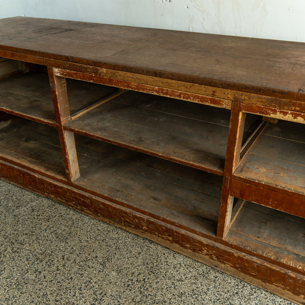 This shop counter is made from an old storefront in Ohio. It has a beautifully aged and patina look. Finished panels on both sides and shelves for storage in the back. Perfect for converting into an island or using as is in a storefront or home bar.