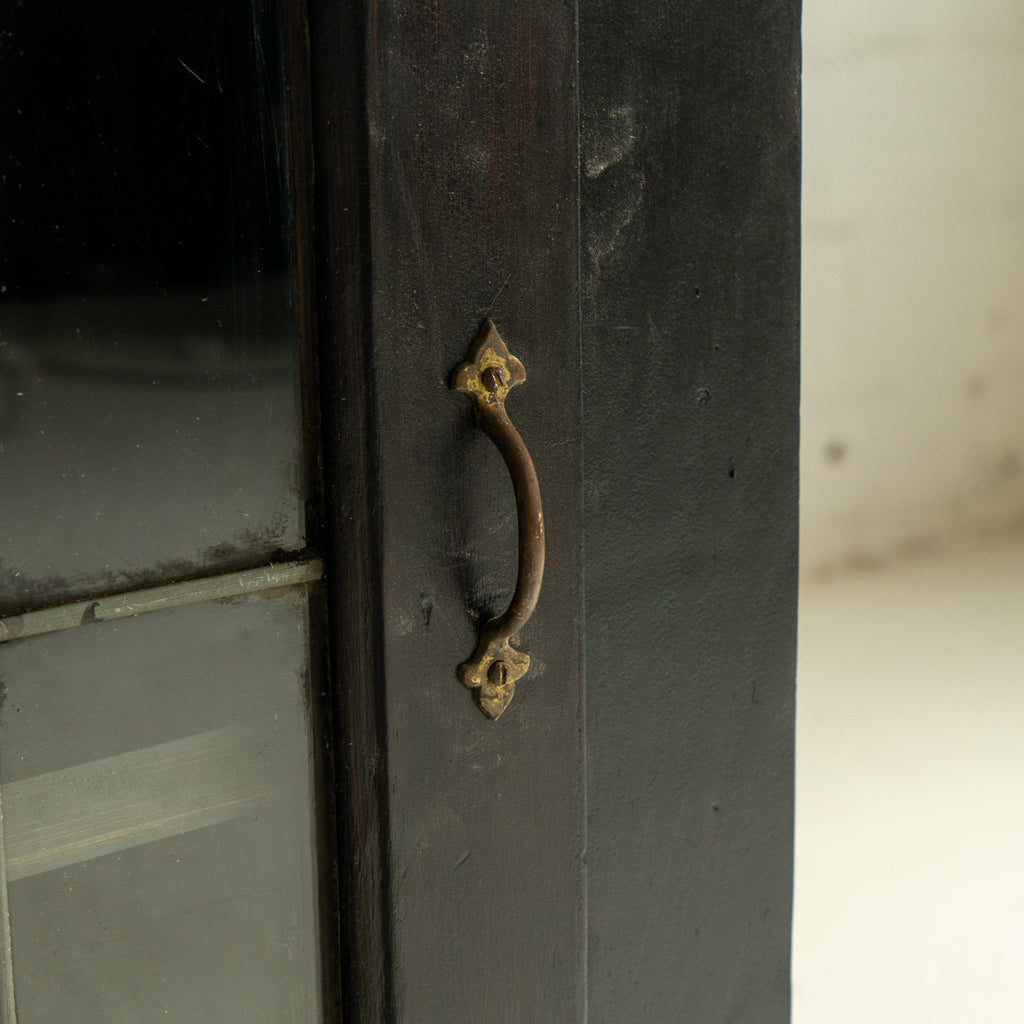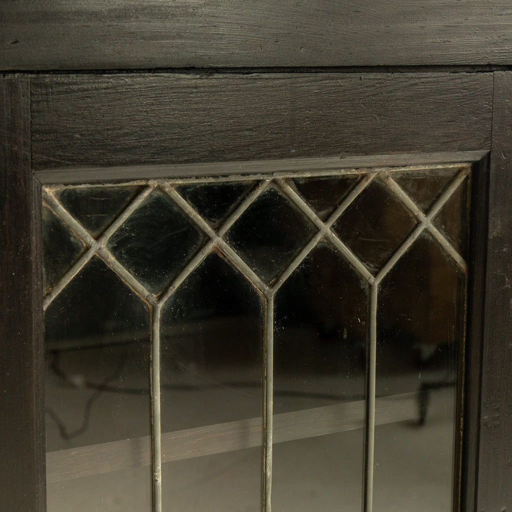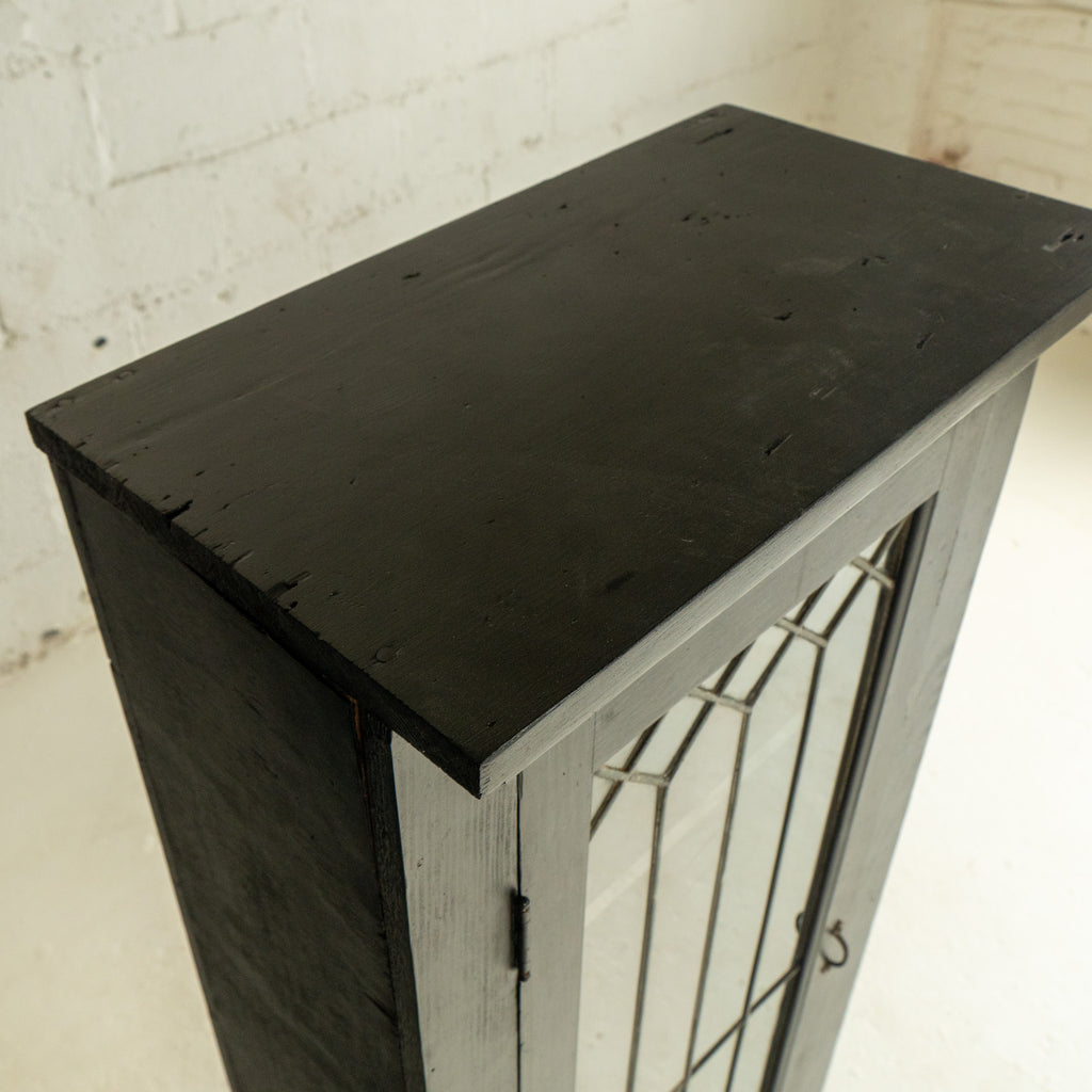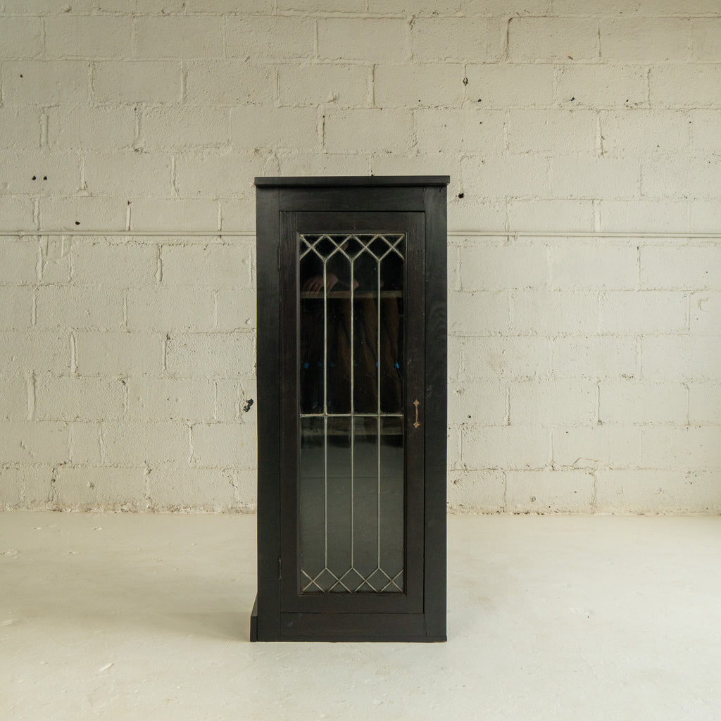Very elegant leaded glass cabinet. Crafted in wood and painted black featuring an amazing leaded glass door. The cabinet has two shelves inside and a detailed metal handle, this cabinet makes a subtle statement.