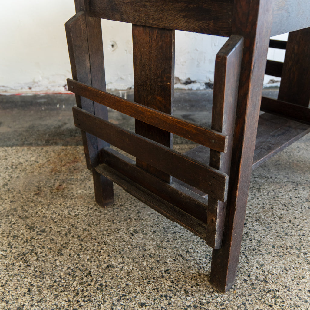 A solid dark wood table with a leather wrapped top. This table also features two slotted holders on each side and a shelf at the bottom for additional storage.