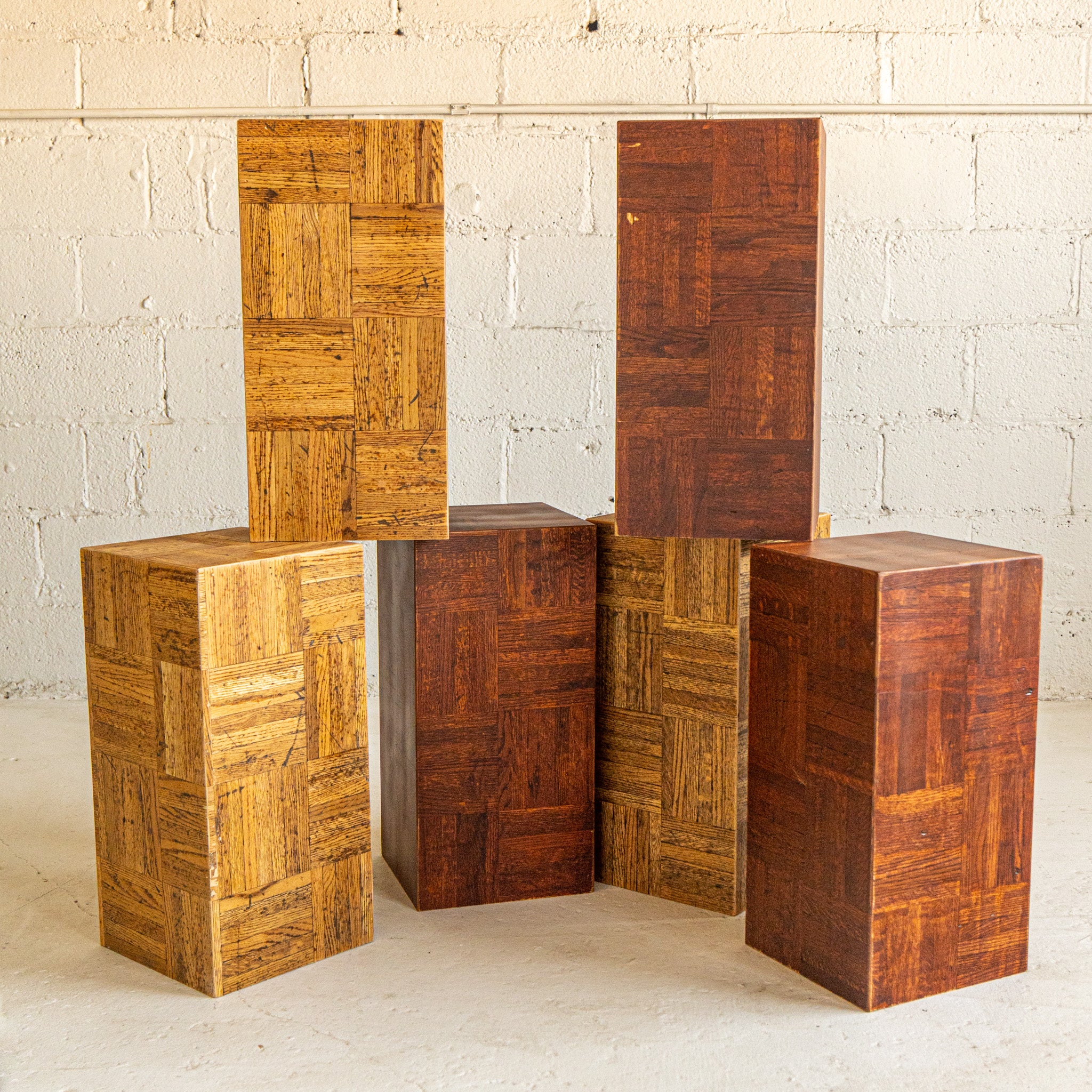 The Paquet End tables are beautifully handcrafted using reclaimed plywood and reclaimed parquet flooring. Salvaged from a Detroit church, the parquet flooring was once a stunning dance floor.